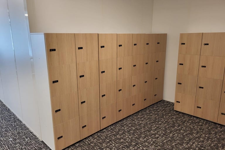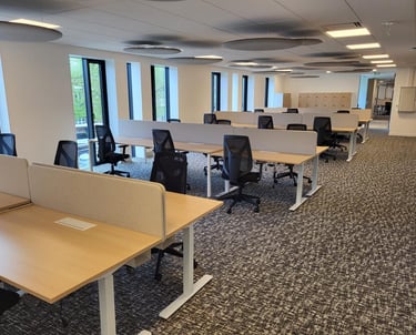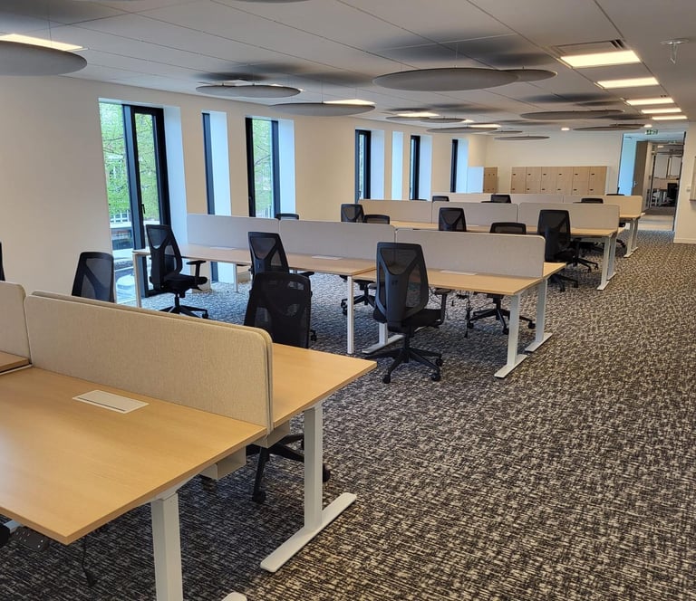 Bureaux partagés : tables de travail, chaises ergonomiques, rangements.