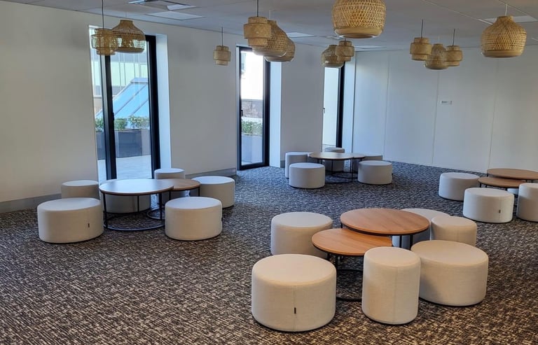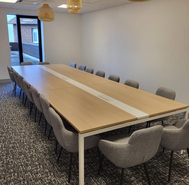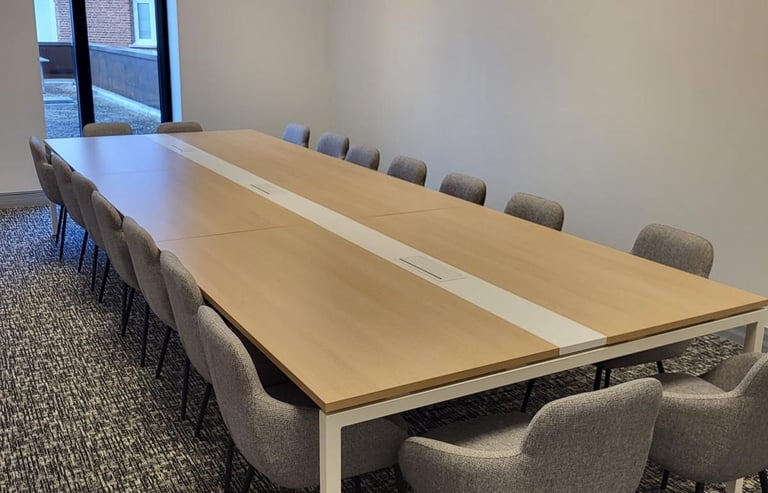 Salles de réunion : grandes tables, chaises, tableaux blancs, équipements audiovisuels.